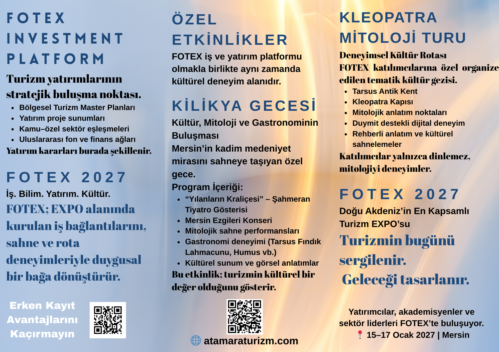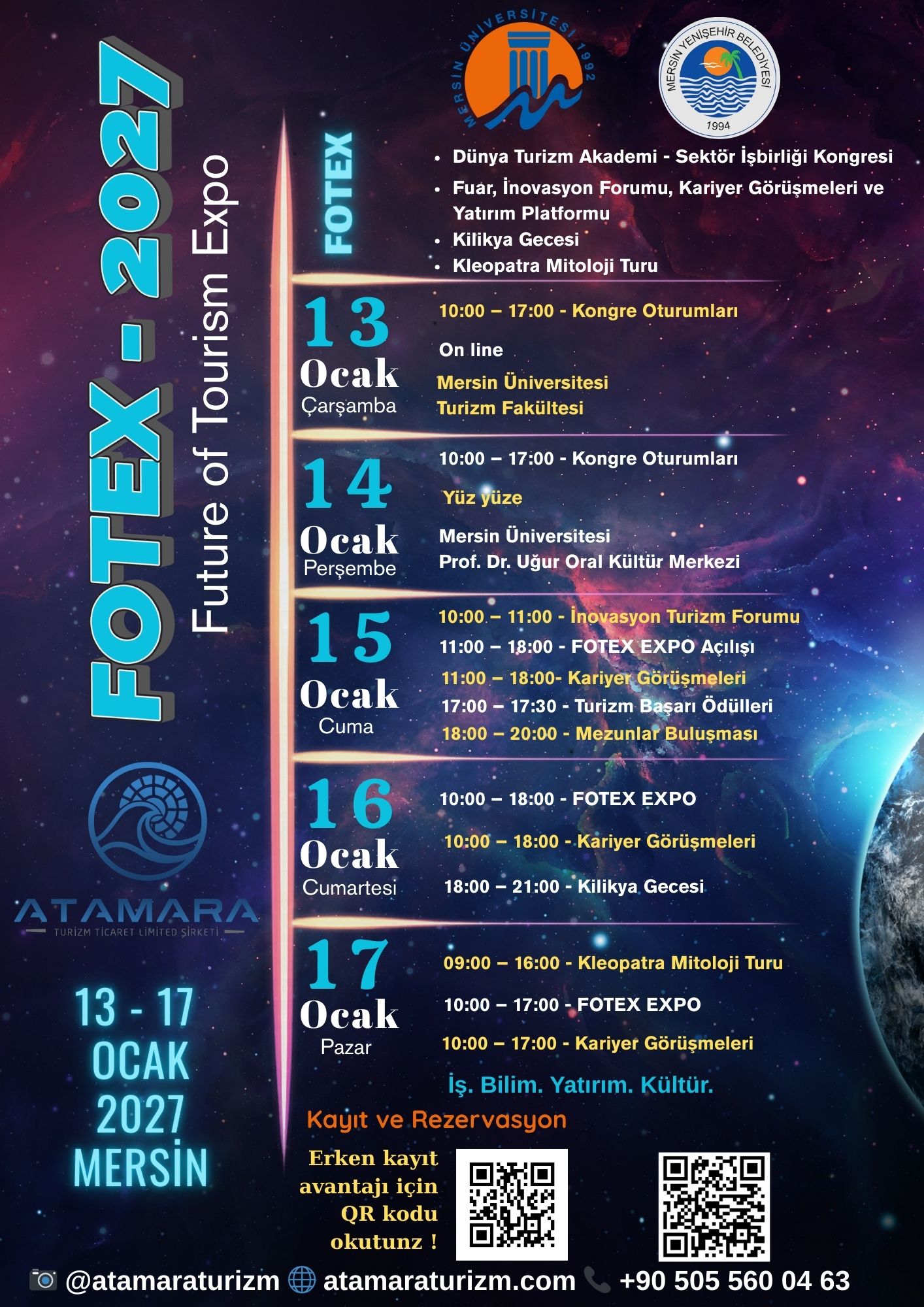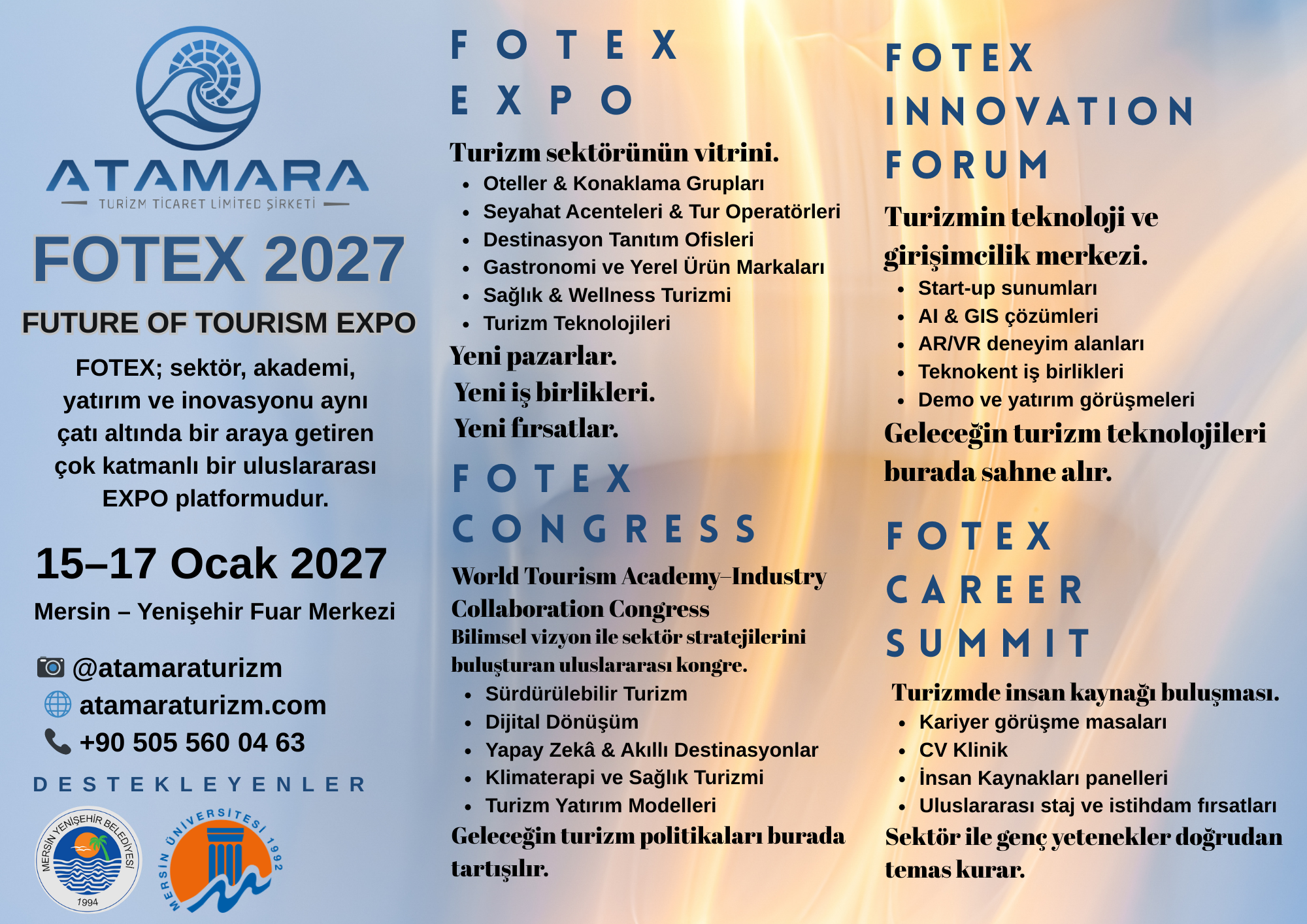 FOTEX 2027, turizm sektörünü, akademiyi, yatırımcıları, teknokentleri ve teknoloji girişimlerini bir araya getiren uluslararası bir turizm platformudur. Mersin Üniversitesi ile Atamara Turizm'un ortak protokolü kapsamında düzenlenen bu etkinlik; kongre oturumları, turizm fuarı, inovasyon forumu, kariyer görüşmeleri ve yatırım buluşmalarıyla sektörün geleceğini şekillendirmektedir. FOTEX kapsamında sürdürülebilir turizm, dijital dönüşüm, akıllı destinasyonlar ve turizm teknolojileri gibi güncel konular ele alınırken; turizm işletmeleri, seyahat acentaları, yatırımcılar, teknokentler, akademisyenler ve girişimciler yeni iş birlikleri ve yatırım fırsatları için bir araya gelecektir.